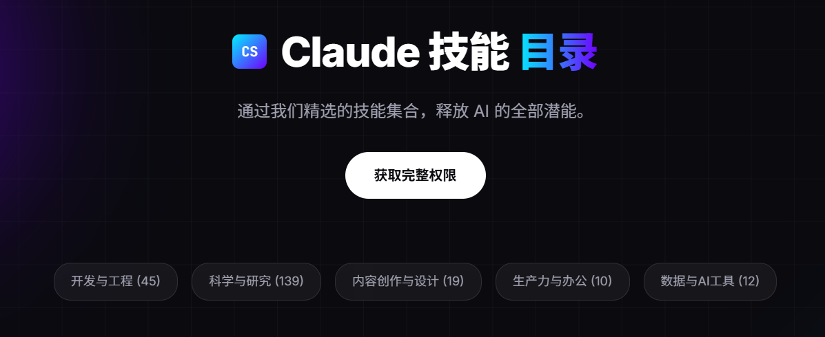 本合集汇集了全网最顶尖的 Claude Skills,旨在解锁 Claude 在特定领域的深度应用能力。通过集成标准化的工具与工作流,将通用 AI 转化为编程、科研、创作及办公领域的垂直专家。本库经过系统化整理与中文本地化索引,确保用户能够快速接入并提升工作流效率。用的完整能力封装。 即插即用: 结构清晰,配置简便,可立即无缝融入现有的工作流程中,显著提升人效。